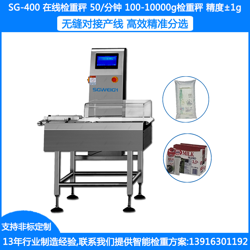 你們?nèi)绾蜗蛭彝扑]合適的自動稱重機(jī):為了給貴司推薦合適的機(jī)型,需要確認(rèn)以下產(chǎn)品要素信息: 1.產(chǎn)品類型,如袋裝,瓶裝,盒裝等 2.產(chǎn)品外形尺寸(長寬高),若有多種規(guī)格請列全或提供最大和最小尺寸。 3.產(chǎn)品重量,若有多種規(guī)格請列全或提供最大和最小重量。 4.速度要求,是否是勻速通過。 5.精度要求(上下偏差多少克為不合格)或檢測多一件少一件。